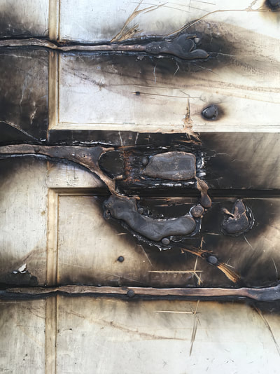 I finished casting a selection of objects taken out of the sculptures made during the exhibition, and worked on the three doors to bring attention to the bronze in alternative ways, developing each one in a different direction; Door 1, I simply polished the bronze and left it in place in the carvings; Door 2, I again polished the bronze slightly and placed each piece below the carved marks, displaying simultaneously the charred shape of the carved ‘mould’ and the cast bronze; Door 3, I worked with the shape of the burns and the bronze and turned it into a landscape painting based on Bristol. I returned to the Gallery Space at the Island and held a final exhibition, displaying the initial collaborative sculptures with the bronze incorporated within them, the doors, and a gallery of images taken throughout the project, alongside photos I took of bronze casting process in Nepal and India.